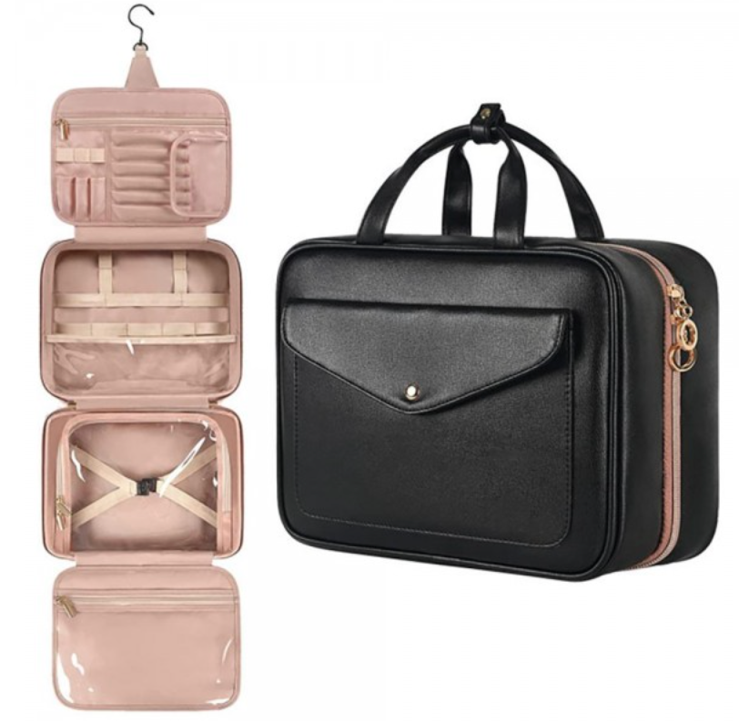 Faux Leather Multi-Compartment Hanging Travel Case With Front Button Pocket- Full Zip Closure- Unfolds With Hanger Hook To 38"L- Four Organization Compartments With Clear Pockets And Elastic Loops- Approximately 12.5"W x 9"H x 5"D