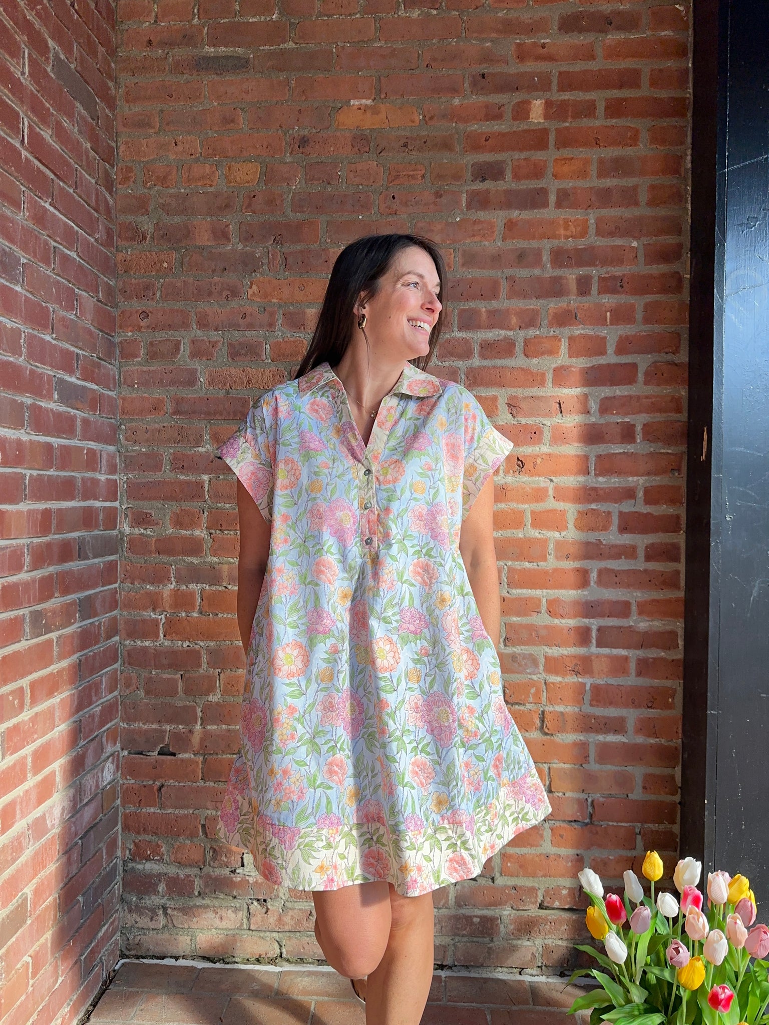 Twirl into spring in this charming light blue mini dress, adorned with delicate florals and finished with a playful contrast border. The front button closure keeps things secure while the hidden side pockets add convenience and utility. Crafted from lightweight, woven fabric with a soft lining, it's breathable enough for warm days and just perfect for casual outings or weekend adventures.