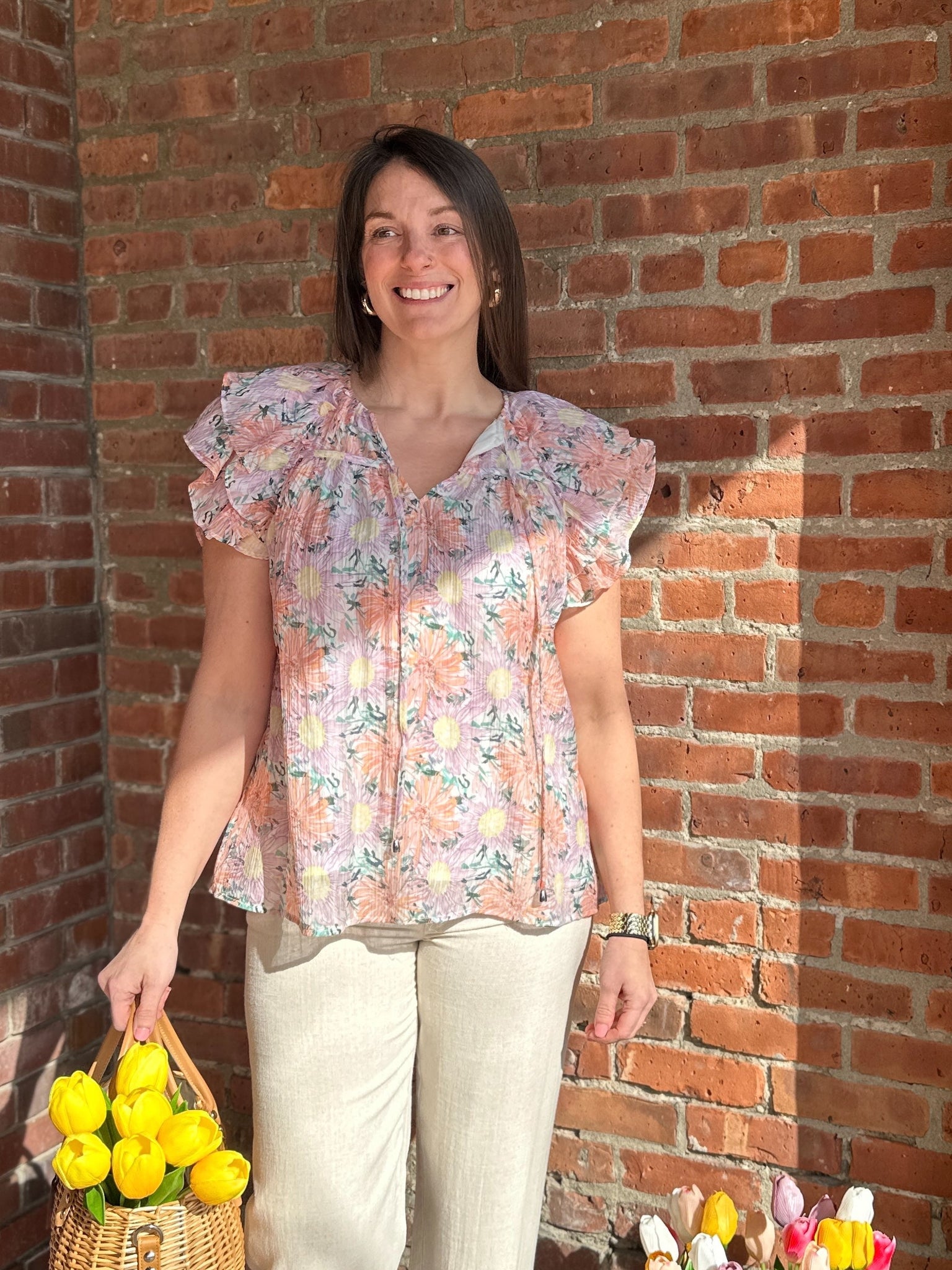 Add a pop of color and style to your spring wardrobe with this gorgeous Spring Floral Tie Front Top. Perfect for brunch or work (or just about any occasion), this top is a versatile and fashionable addition to any look. Don't let spring pass you by without this must-have piece!