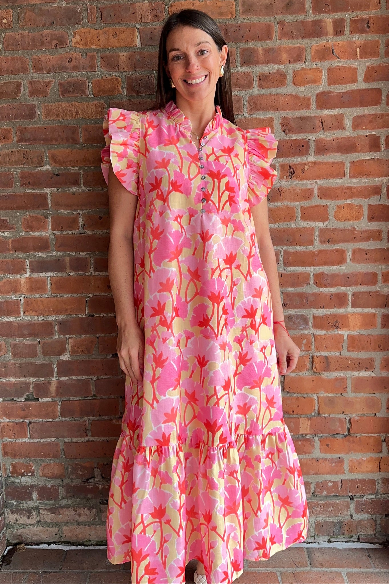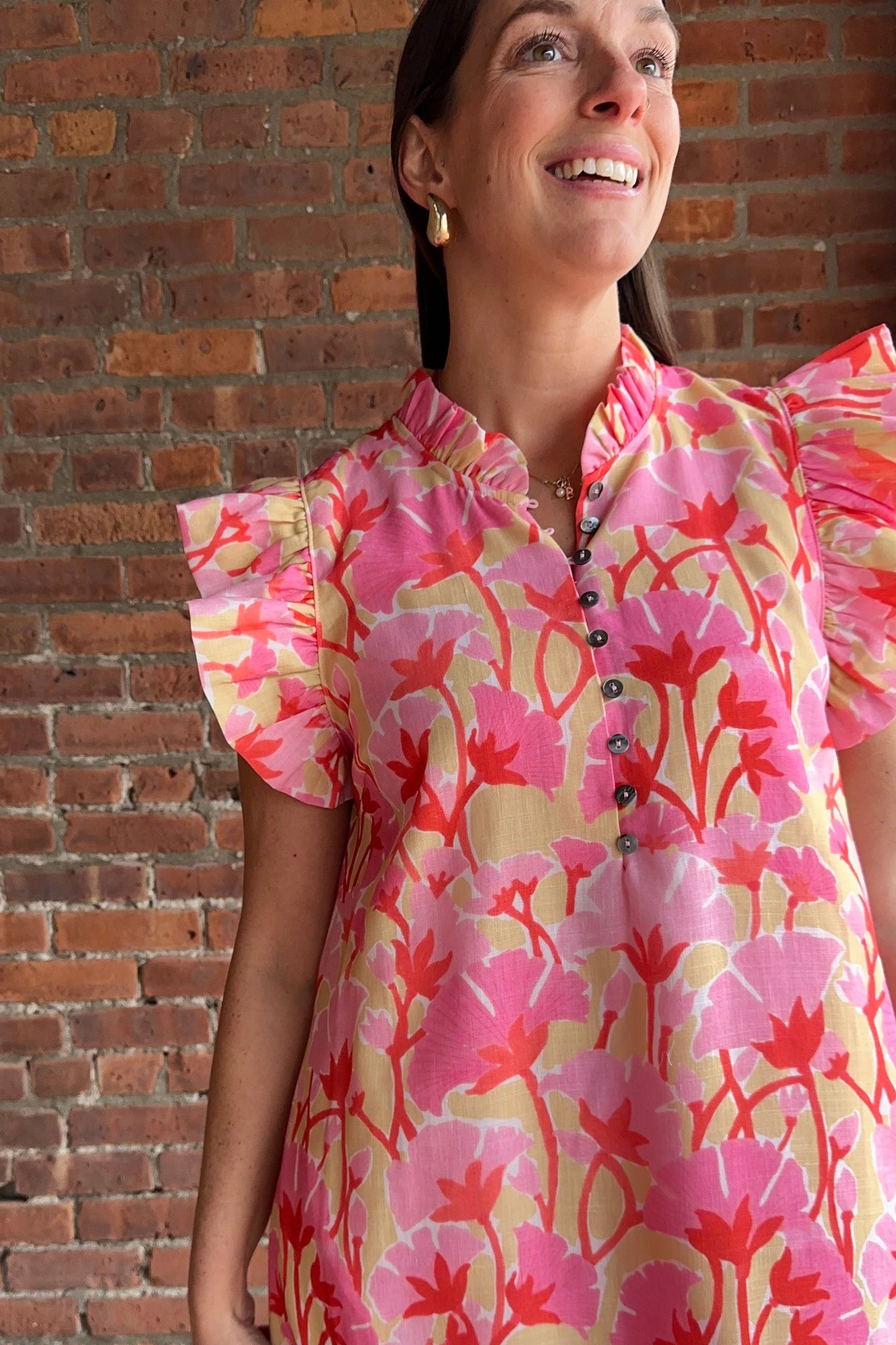 Meet the Aurelia—your new go-to dress for days when you want to feel fabulous. Bright pink and red florals dance across the fabric while ruffled sleeves steal the show with their fun, flirty vibe. The ruffled mock neck keeps things interesting, and the front button closure means zero fuss when you're getting ready. Bonus: hidden side pockets for all your essentials. It's the perfect blend of playful style and practical comfort that actually works for real life.