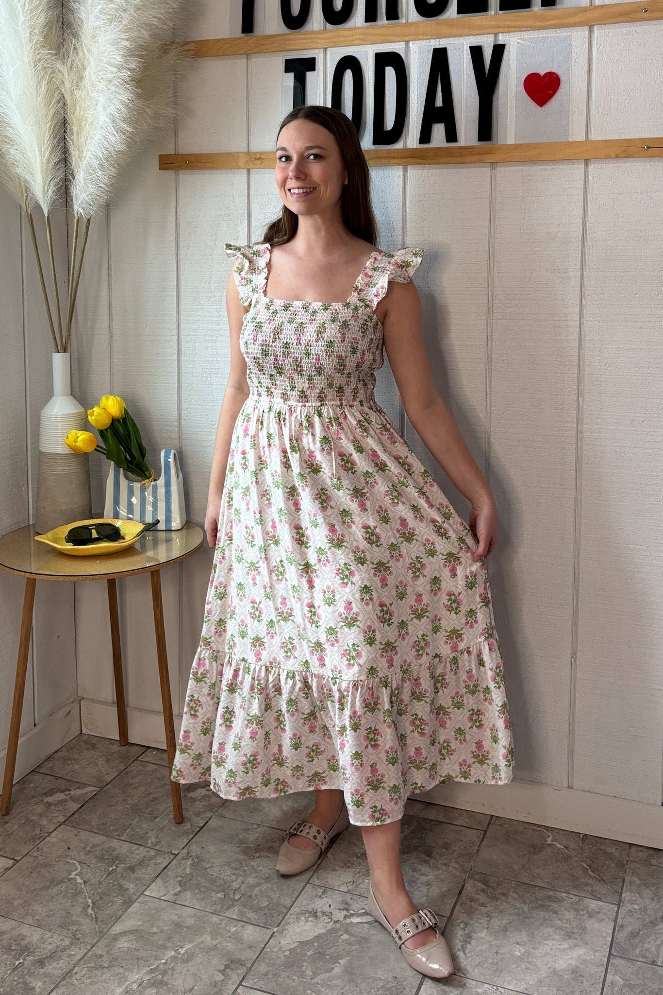 Agnes | Pink Floral Tile Pattern Smocked Sleeveless Midi Dress