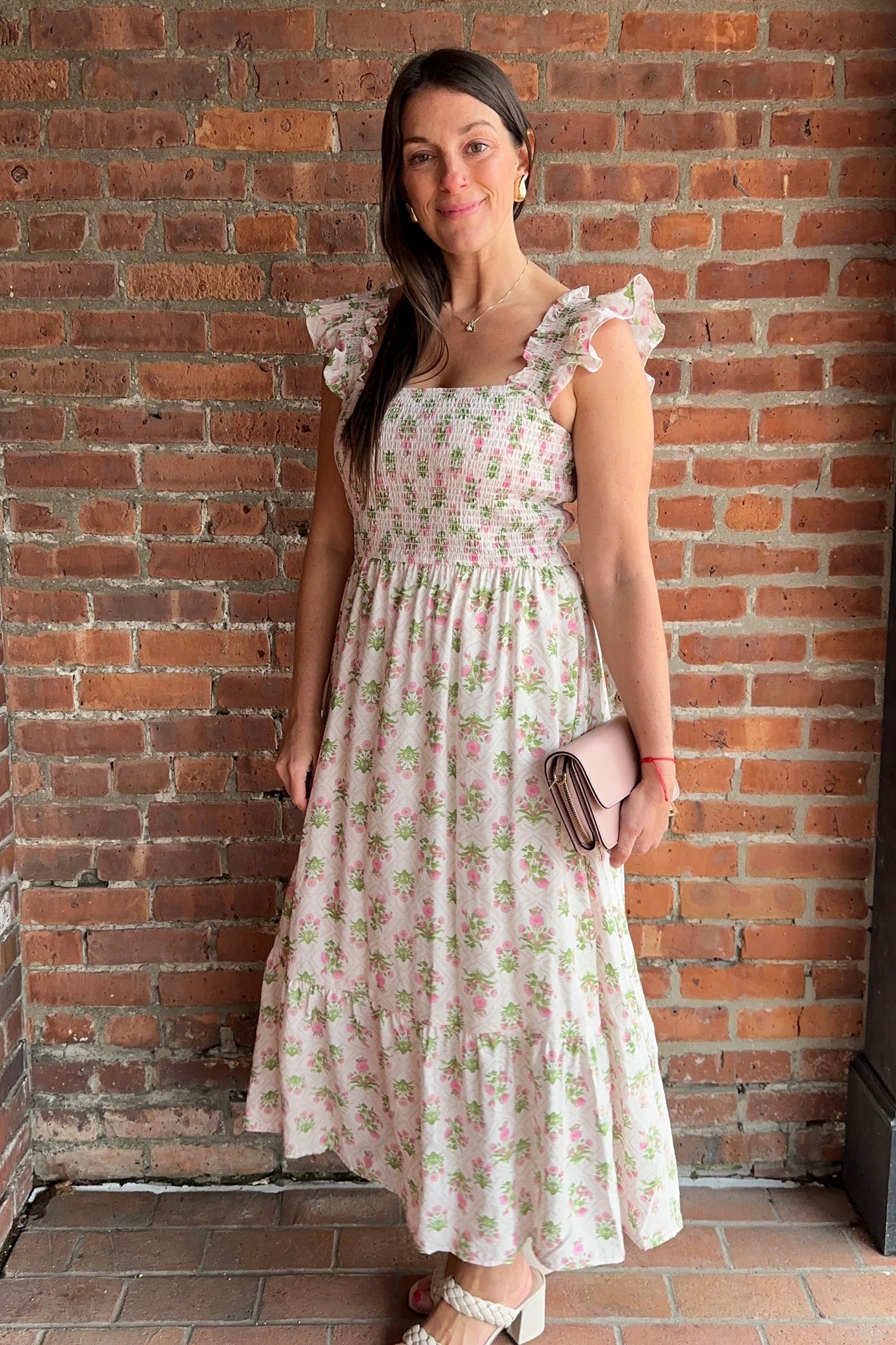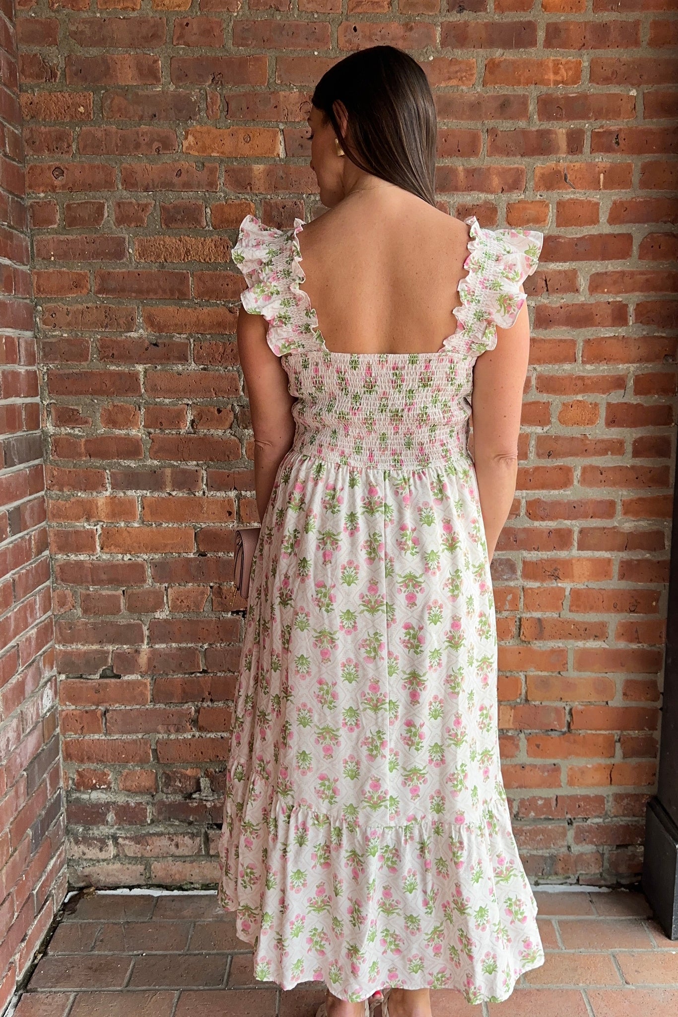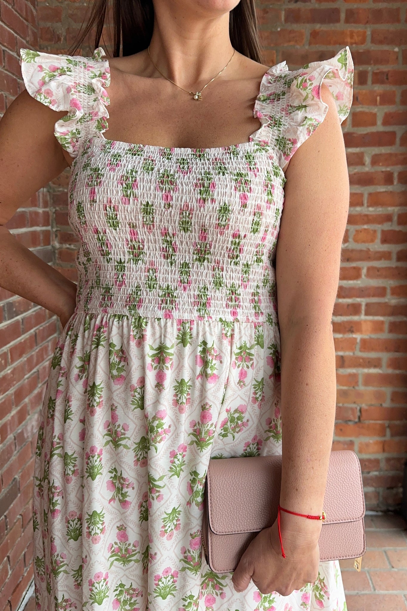 The square neckline frames your shoulders beautifully, while the smocked bodice creates gorgeous texture and visual interest. The playful ruffle hem adds movement and whimsy to the silhouette, while the fully lined construction keeps you feeling confident and comfortable throughout the day. The vibrant floral pattern brings joy and personality to each wear no matter where you're heading.