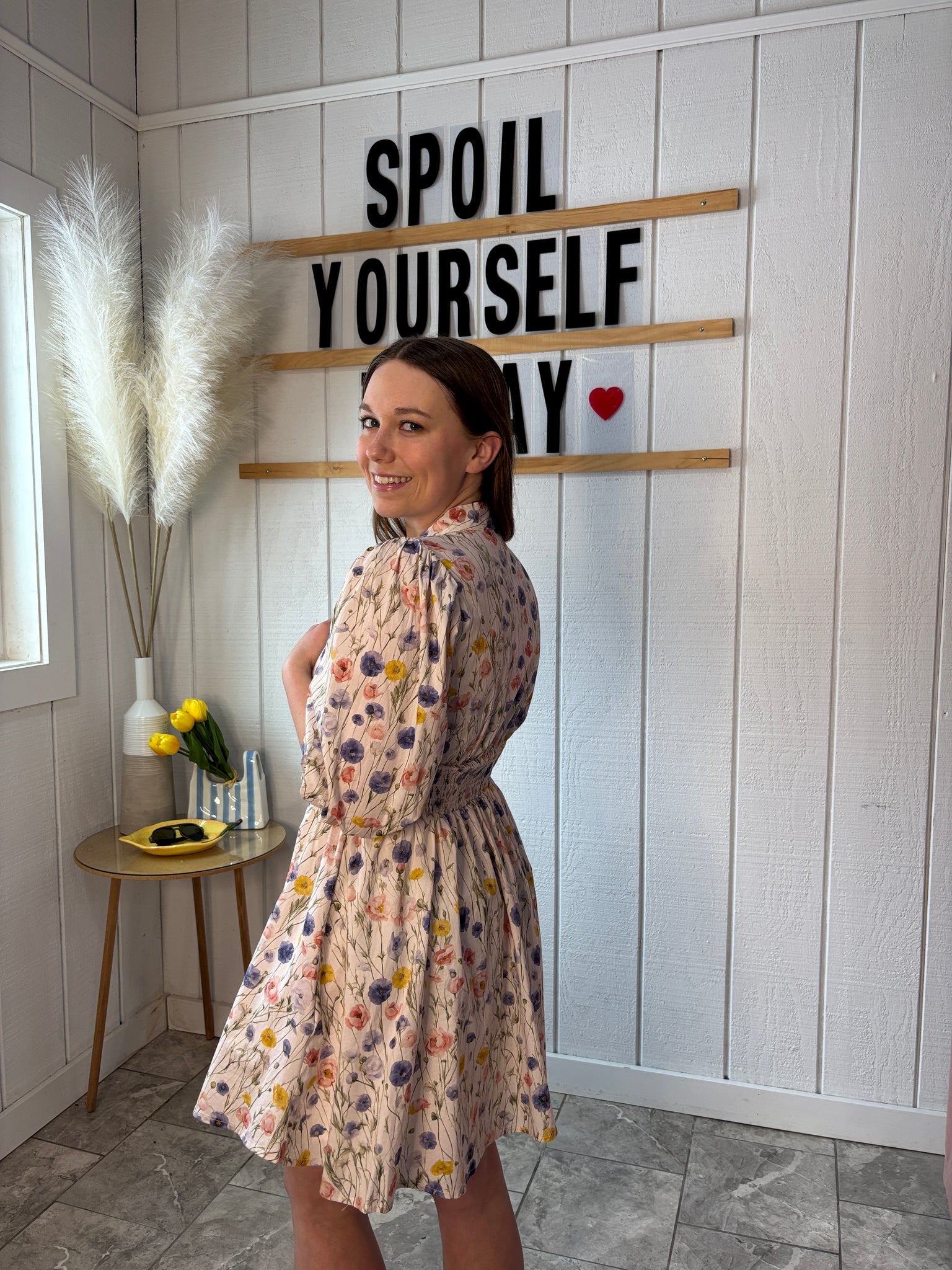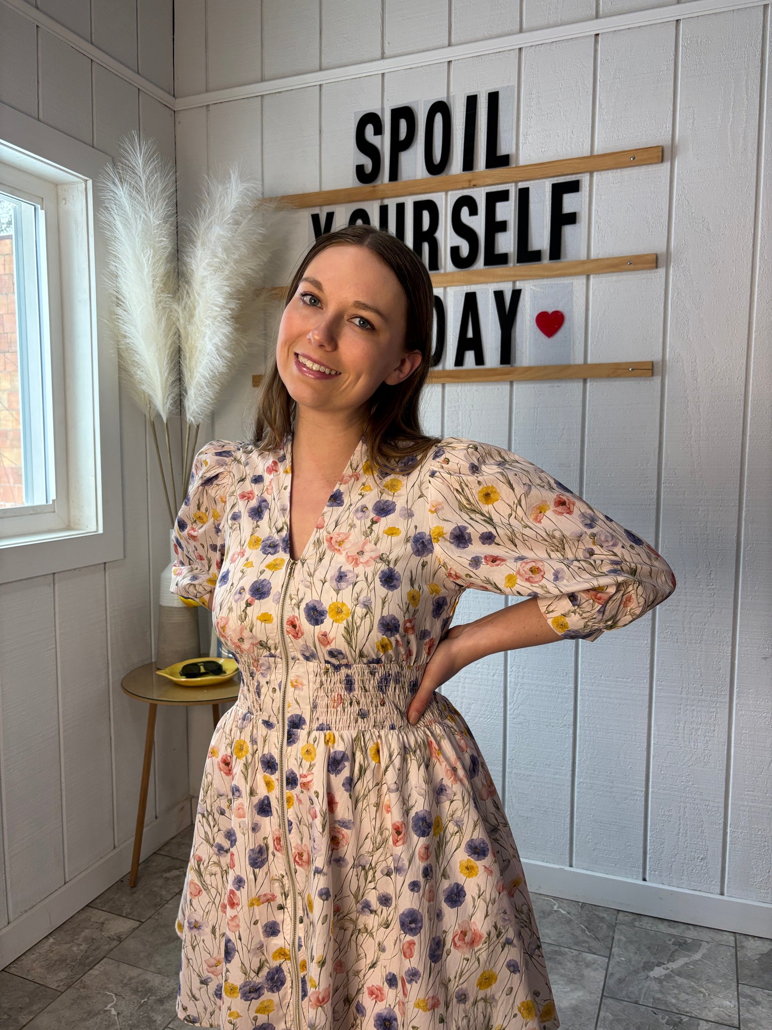 This charming dress features an all-over, multi-color floral print on a neutral cream background. The convenient front zipper makes getting dressed a breeze, while the elastic waistband guarantees a comfortable fit. The timeless design of this dress means it will work perfectly for almost any occasion, from casual outings to special events. A versatile piece that deserves a spot in every closet.