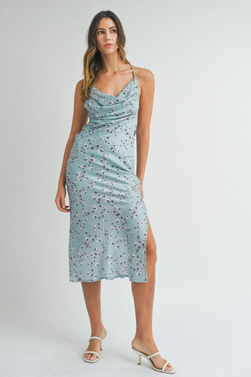 Blue Satin floral print back lace up strap cowl neck midi dress