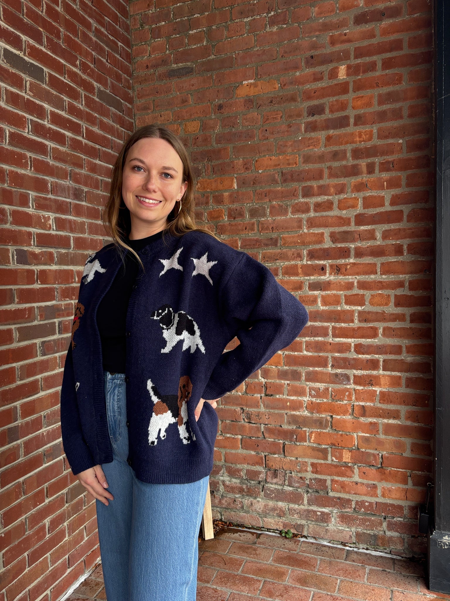 Calling all dog-lovers! Indulge in luxury and comfort with our Dog Knit Sweater Cardigan in Navy. This beautifully crafted piece features various adorable dog breeds woven into its soft fabric, showcasing your love for your furry friends. With this cardigan, you'll stay cozy and stylish all season long.