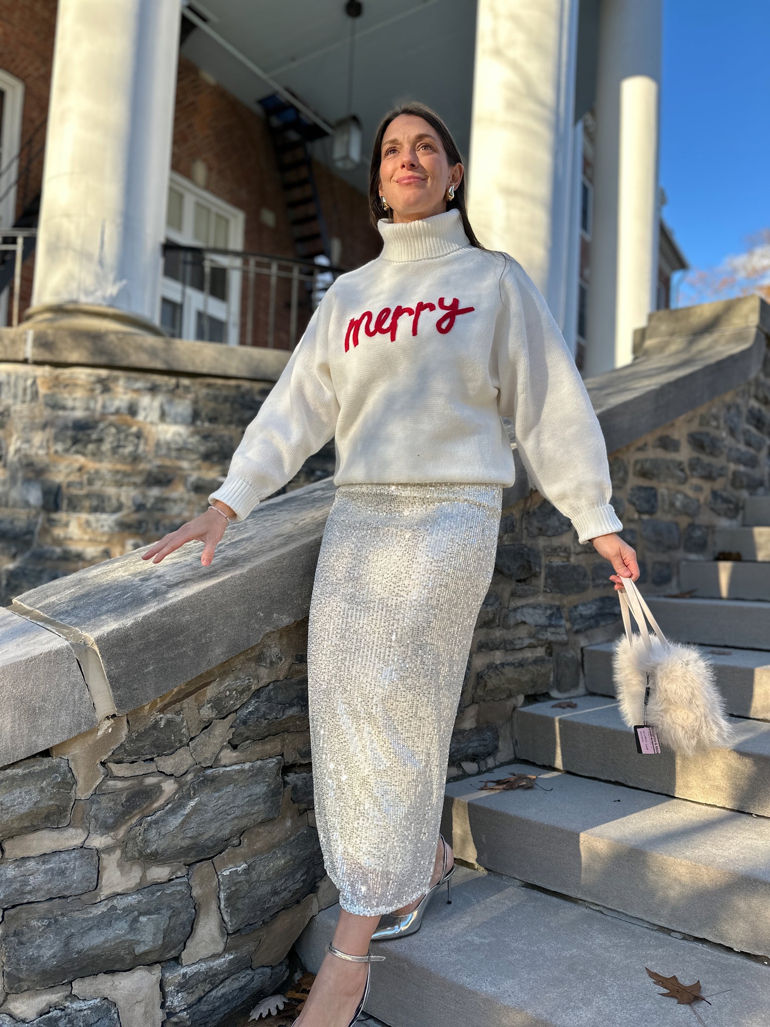 Get holiday-ready in this cheerful turtleneck sweater with fuzzy "merry" embroidery front and center. Ultra-cozy with a relaxed fit and chunky ribbed neck....perfect for fireside lounging and gift wrapping.