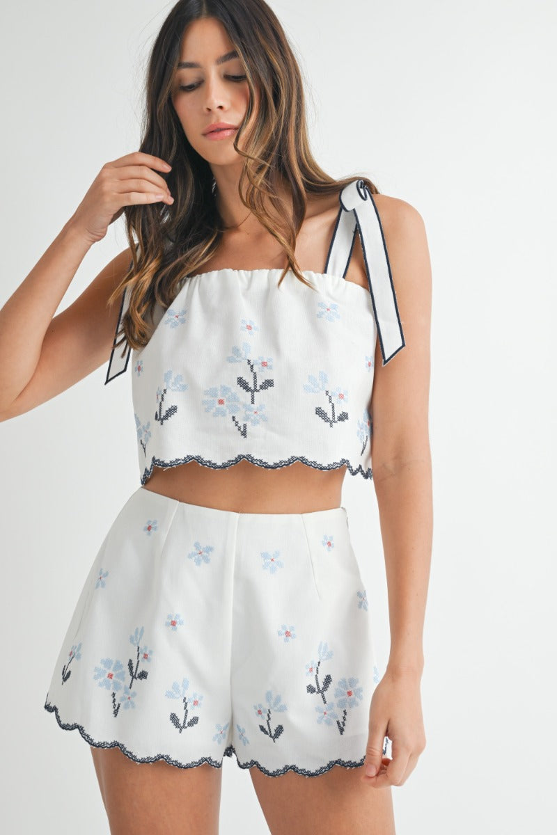 Linen mix floral embroidered scallop crop top with self-tie shoulder strap and matching scallop shorts set.