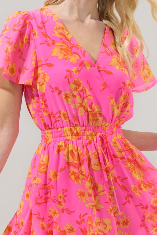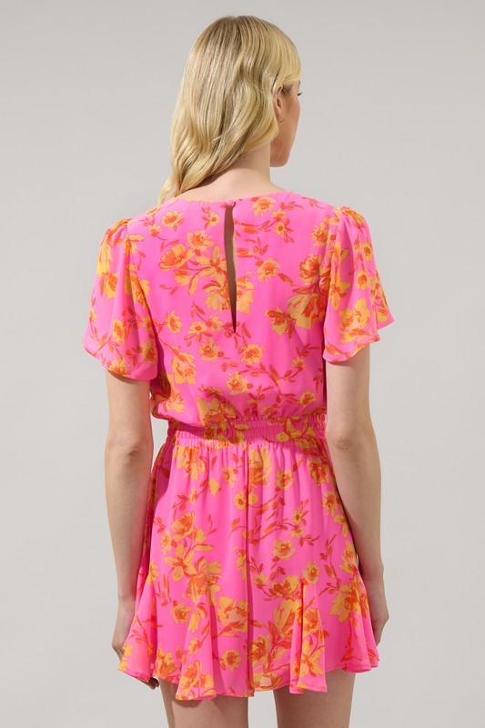Feeling hot hot hot. Vibrant orange floral clusters lay against a bold fuchsia stunning Romper. It has short flutter sleeves that frame a wrapped surplice bodice with adjustable drawstrings. Wear it with heels and a sleek updo for a fun night out.
