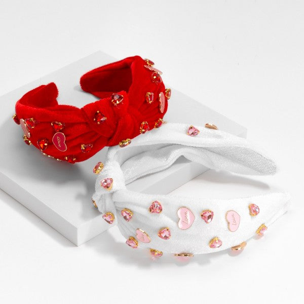 Knotted Velour Headband With Rhinestone Hearts and Enamel "Love" Heart Details- One Size Fits Most