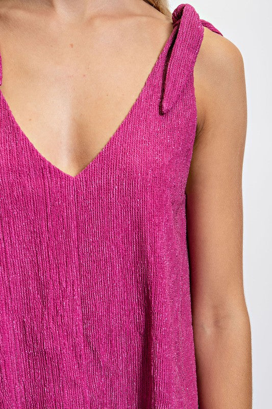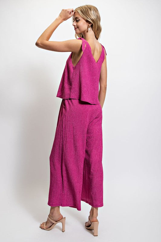 The Harper Berry Jumpsuit combines modern elegance with timeless design, featuring a sheer illusion neckline that adds a subtle allure. Delicate shoulder ties enhance the refined silhouette, offering adjustable comfort and a feminine touch. Tailored to flatter, this jumpsuit drapes beautifully, making it perfect for upscale events or stylish everyday wear. Its versatile design ensures you stand out with understated sophistication wherever you go.