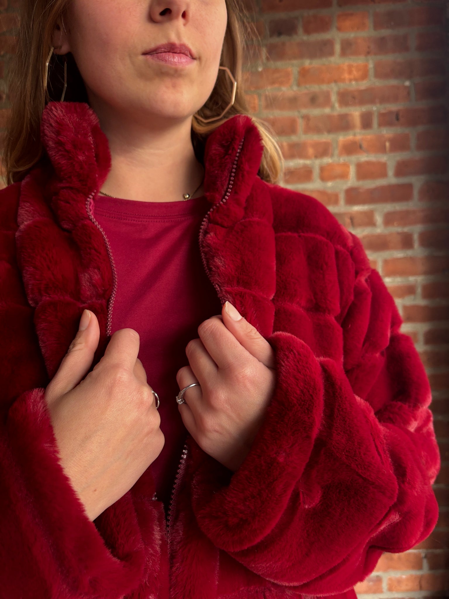 Wrap yourself in luxury with our Mallory Faux Fur Jacket. The deep red hue adds a touch of sophistication to any outfit. The tiered design and plush collar make you feel like you're enveloped in a warm hug. This jacket is a must-have for chilly days and elevates any wardrobe. You'll never want to take it off!