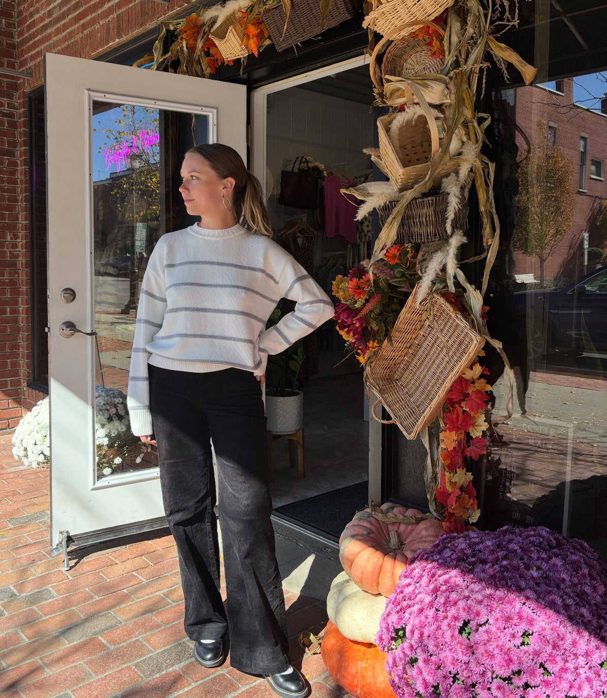 Indulge in this luxuriously soft and stylish boyfriend stripe sweater that will elevate your wardrobe to another level. Made from the finest materials and woven with precision, this sweater boasts a timeless design that exudes an air of sophistication and exclusivity. Perfect for cozy nights by the fire or a day out on the town, this sweater is a must-have for anyone seeking to add a touch of elegance to their outfit.