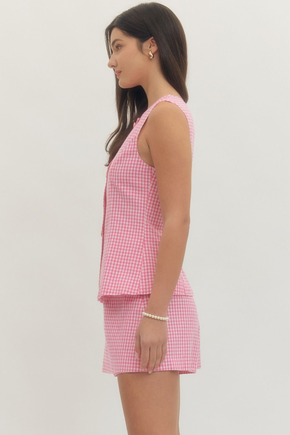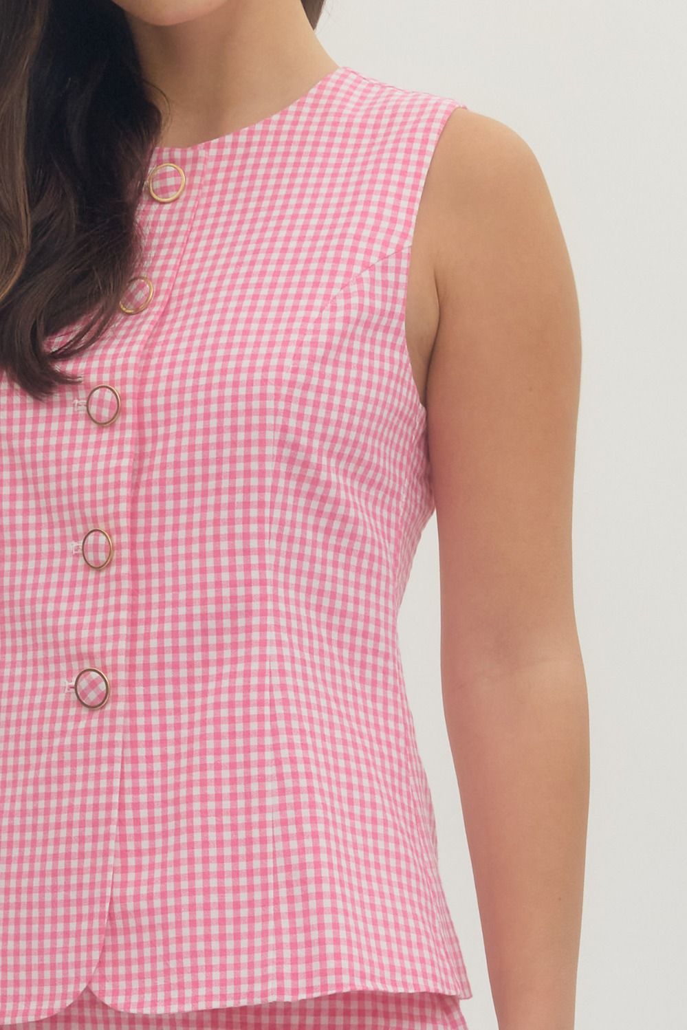 Meet Lilian, a refined pink gingham sleeveless romper that seamlessly blends style and practicality. This sophisticated one-piece features a front button closure on top and a side zipper on the bottom, creating a segmented look that gives the appearance of a coordinated separates set. Crafted from lightweight woven fabric with a lined construction, it offers modest coverage without transparency. Perfect for elevated casual occasions.