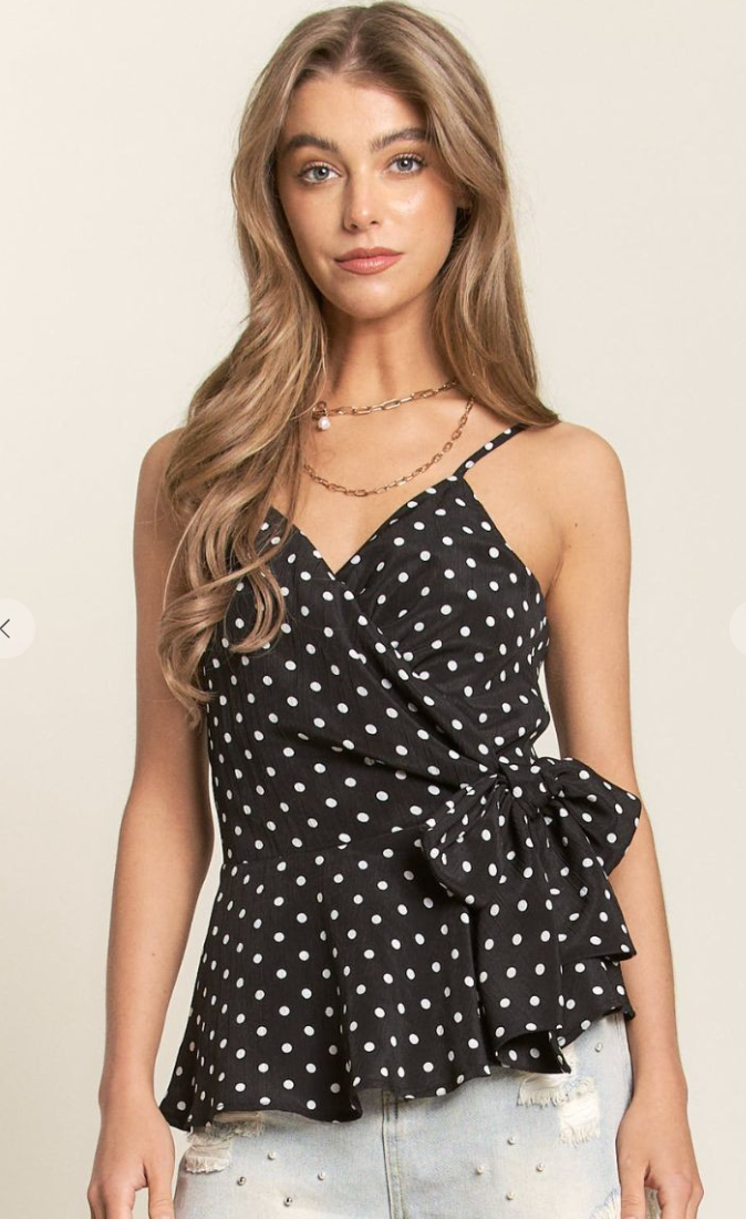 Classy meets fun! This Classic Polka Dot top features a wrap design that creates a playful peplum-style body. The adjustable Spaghetti straps and wrap bow give this top a sassy feel while upleveling your next brunch or date night.