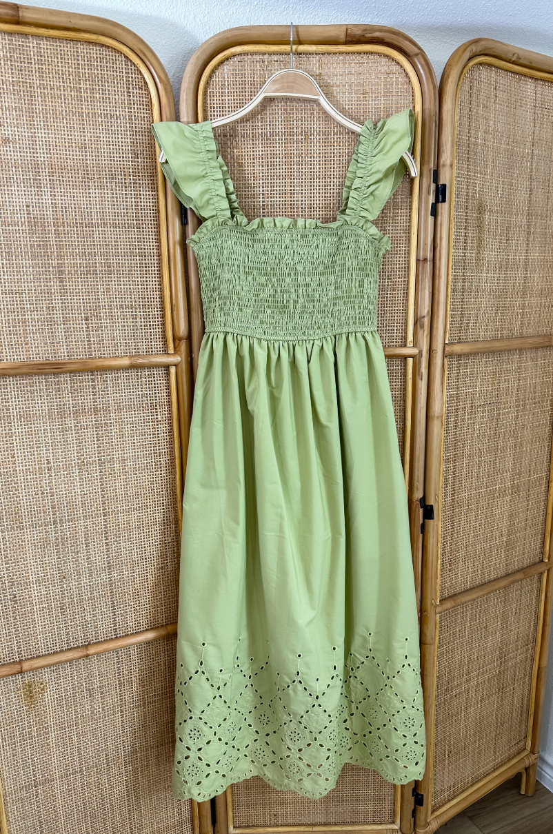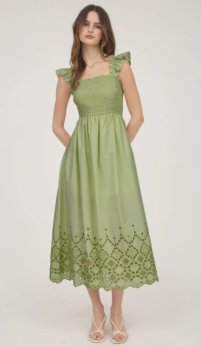 The "Becky Dress" is effortlessly feminine with a flattering smocked bodice, sweet ruffle straps, and a breezy A-line fit. Finished with a scalloped eyelet hem and fully lined for comfort, this midi is a go-to for sunny days, casual gatherings, or dressing up just because. Timeless, comfy, and so easy to wear—you’ll reach for it on repeat.
