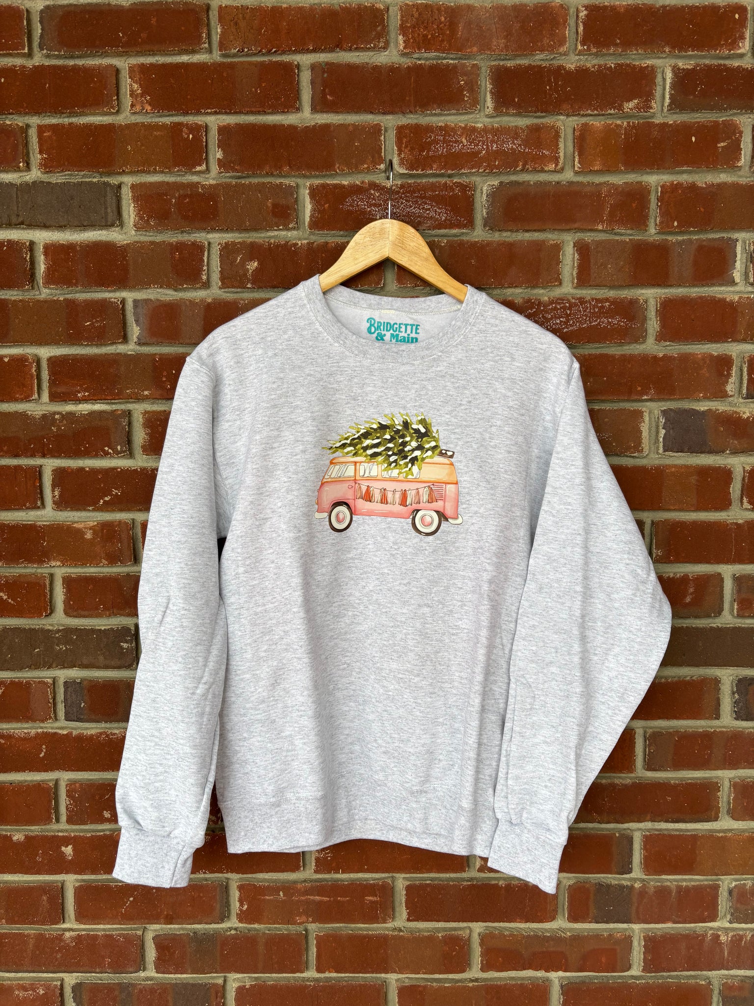 Wrap yourself in holiday cheer with this adorable holiday graphic sweatshirt! Featuring a whimsical hippie van decked out in holiday cheer, this playful piece brings festive flair to your seasonal wardrobe. This comfortable sweatshirt is perfect for casual holiday gatherings, lazy winter days, or spreading joy wherever you go. Whether you're decorating, celebrating, or simply embracing the festive spirit, this charming graphic apparel is sure to spark smiles and compliments.