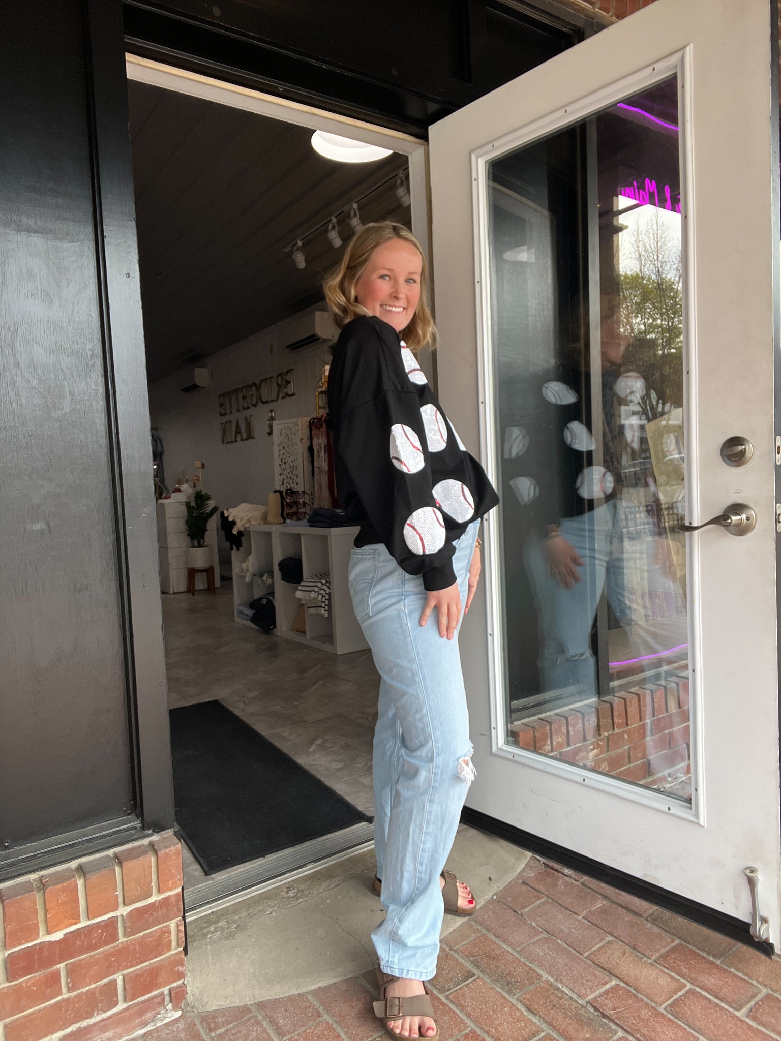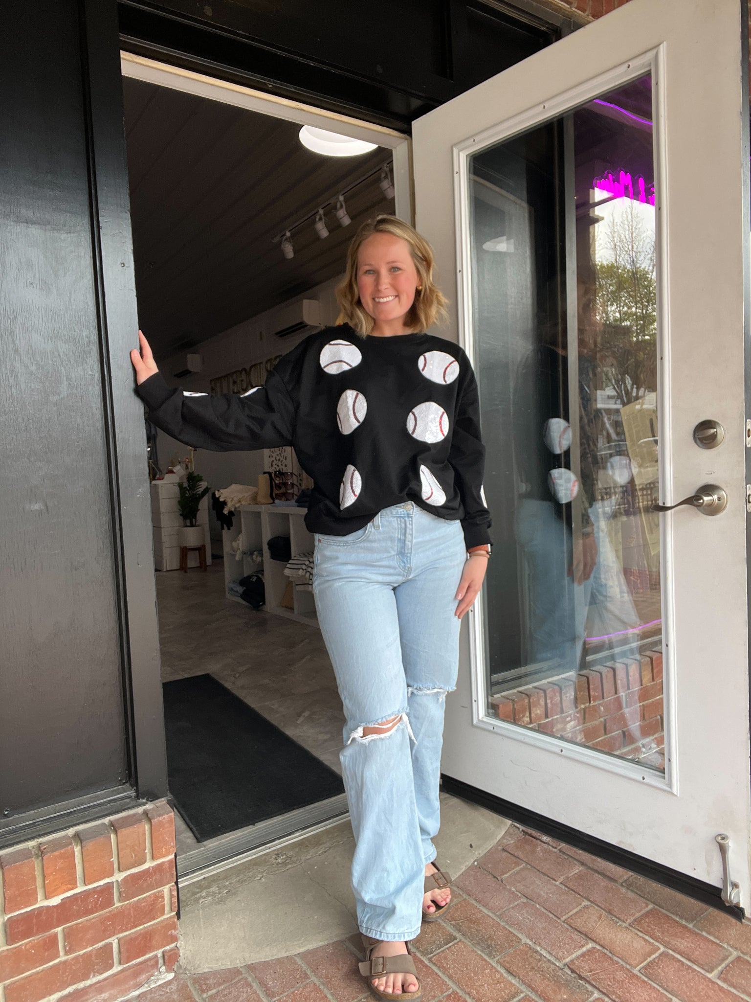 Sequin Baseball Long Sleeve Shirt in Black